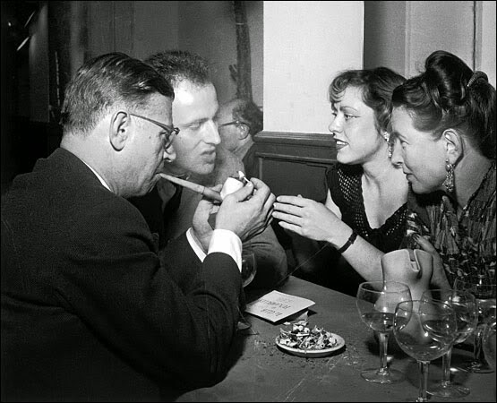El centro de la vida artística, literaria e intelectual de la época la constituián los cafés de Saint-Germain-des-Prés, entre ellos Deux Margots, Rhumerie, y sobre todo, el Flore. La principal personalidad que frecuentaba este último era, nada mas y nada menos que Jean-Paul Sartre, que se convirtió en una figura de culto. De esta forma, el existencialismo llegó a convertirse en una posición vital de moda, que partiendo de París se extendió por toda Europa. Por existencialista se conocía en cierta medida todo aquello que se dirigía contra las convenciones de la sociedad. En la obra de Boris Vian que obedece al título de "Manual de Saint-Germain-des-Prés", éste caricaturiza la idea burguesa de la vida bohemia de los existencialistas, quienes despues de pasearse por los distintos cafés antes indicados, terminaban el día en clubs, donde se entregaban a juergas del todo desenfrenadas.